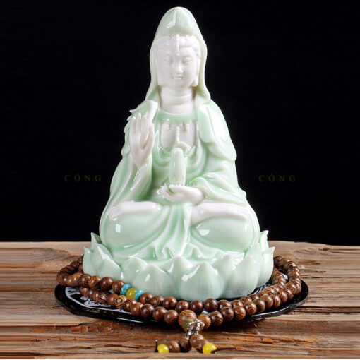 Tượng Quan Âm được chế tác từ chất liệu gốm sứ cao cấp với hai gam màu chủ đạo là trắng và ngọc xanh, mang lại cảm giác nhẹ nhàng, thanh khiết. Tượng được thiết kế trong tư thế ngồi trên đài sen – biểu tượng của sự giác ngộ và thanh tịnh. Đài sen không chỉ là nơi an tọa của Quan Âm mà còn đại diện cho trí tuệ siêu việt và tâm hồn trong sáng.
