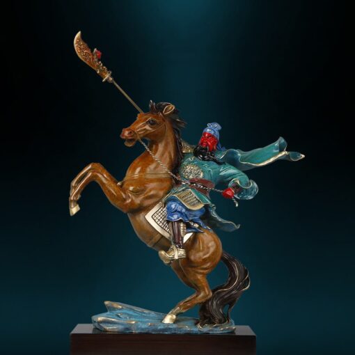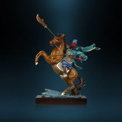 Chú ngựa trong tượng được tạo hình sống động, mạnh mẽ, trong tư thế phi nước đại, thể hiện sự tiến công và vượt mọi thử thách. Tất cả các chi tiết, từ áo giáp, áo choàng của Quan Công đến dáng ngựa đều được chăm chút tỉ mỉ, mang lại tổng thể uy nghiêm và ấn tượng mạnh mẽ.