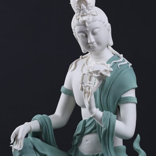 Hình tượng Bồ Tát với dáng ngồi tĩnh lặng, tay cầm hoa sen có khả năng hóa giải năng lượng xấu, bảo vệ gia đình khỏi những điều không may.