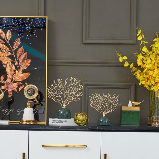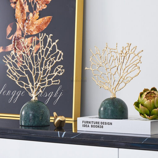 Sự hòa quyện giữa màu vàng hoàng kim và sắc xanh của đế đá tạo nên sự tương phản đầy nổi bật, khiến sản phẩm trở thành điểm nhấn trong không gian nội thất. Đế đá màu xanh cẩm thạch vừa mang đến vẻ đẹp sang trọng, vừa làm nổi bật sắc vàng quý phái của tượng san hô.