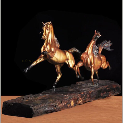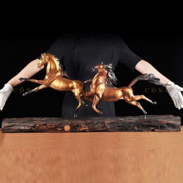 Tượng song mã phi nước đại được làm từ đồng nguyên chất kết hợp đế gỗ