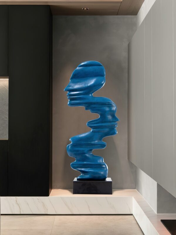 Tượng decor này được hoàn thiện với màu xanh dương hiện đại, phù hợp với các xu hướng trang trí nội thất hiện nay. Màu sắc này không chỉ mang lại cảm giác thanh lịch, trang nhã mà còn giúp sản phẩm nổi bật trong không gian. Sự kết hợp giữa thiết kế trừu tượng và màu sắc hiện đại khiến sản phẩm trở thành một điểm nhấn nghệ thuật đầy phong cách.