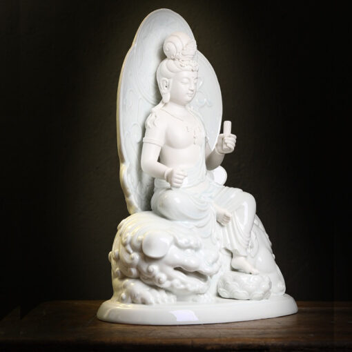 Với chất liệu gốm sứ cao cấp, tượng Văn Thù Bồ Tát được chạm khắc tỉ mỉ, từ chi tiết trang phục, các nếp áo đến hoa văn trên đế tượng. Sự tinh tế này mang lại vẻ đẹp hoàn mỹ, đồng thời thể hiện lòng tôn kính đối với vị Bồ Tát trí tuệ.