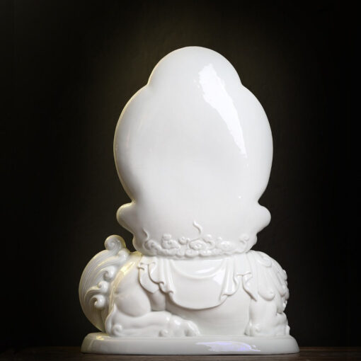 Tượng được làm từ gốm sứ cao cấp, chất liệu phổ biến trong chế tác tượng Phật vì độ bền cao và khả năng giữ được nét đẹp lâu dài. Chất liệu gốm sứ không chỉ mang lại vẻ sáng bóng mà còn giúp tượng duy trì được giá trị thẩm mỹ qua thời gian.