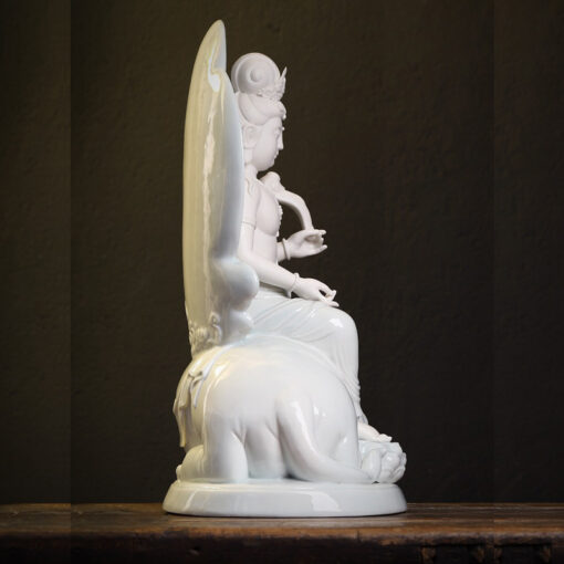Màu trắng ngà của gốm sứ giúp tượng Văn Thù Bồ Tát toát lên vẻ thanh tao và uy nghiêm. Đây là màu sắc trang nhã, phù hợp với không gian thờ cúng và tạo ra cảm giác thanh tịnh, yên bình cho người chiêm ngưỡng.