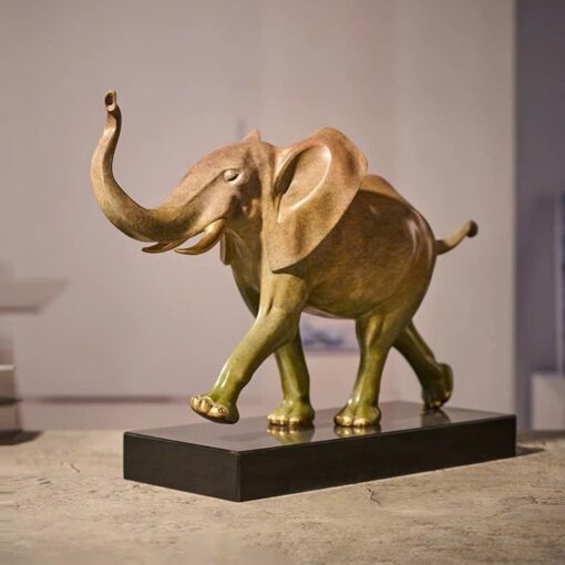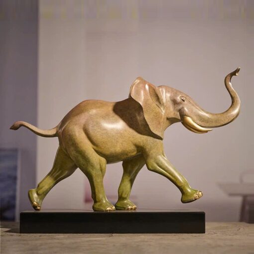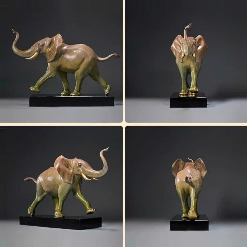 Bức tượng được tạo hình với dáng đi vững vàng, uy nghiêm của một chú voi đang tiến bước, đầu ngẩng cao thể hiện sự tự tin và quyền lực. Mỗi chi tiết từ vòi, tai, chân, đến đuôi đều được chạm khắc tinh xảo, thể hiện nét độc đáo của nghệ thuật đúc đồng truyền thống, đồng thời truyền tải năng lượng phong thủy tích cực.