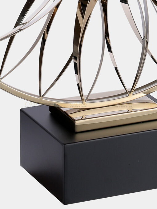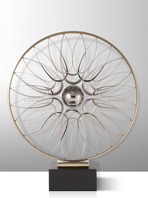 Tác phẩm nghệ thuật này được chế tác từ kim loại cao cấp với các đường nét uốn lượn mềm mại, tạo thành những cánh hoa đan xen và mở rộng từ tâm điểm. Chính giữa vòng tròn là một quả cầu sáng bóng, đại diện cho ánh sáng nội tâm và sự khởi đầu mới. Thiết kế này không chỉ mang lại tính thẩm mỹ cao mà còn thể hiện được sự sáng tạo và công phu trong từng chi tiết.