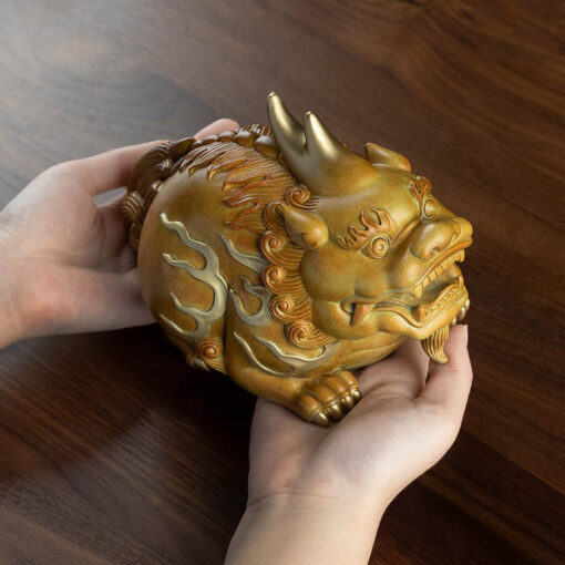Tượng Tỳ Hưu Uy Phong Tài Lộc Để Bàn được thiết kế với kiểu dáng mạnh mẽ, thần thái uy nghi và các chi tiết chạm khắc tinh xảo. Đôi mắt sắc bén, hàm răng nhọn, và bộ lông uốn lượn đều được chăm chút kỹ lưỡng, tạo nên một linh vật sống động và chân thực.